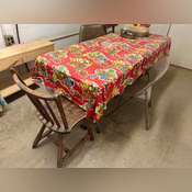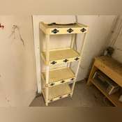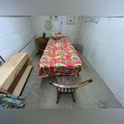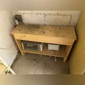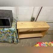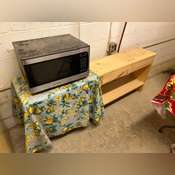 is plugged in and working, 6’ Folding Table, 4 Chairs, 1 Stool, 3 Shelves On the Floor